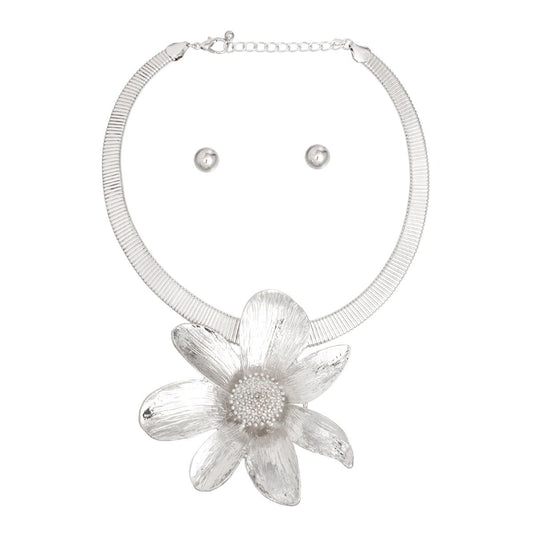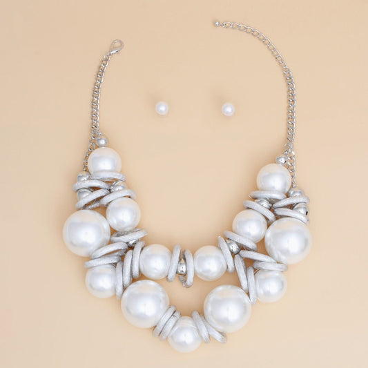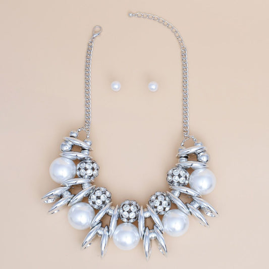 Necklace Jumbo White Pearl Silver Link Bib Set